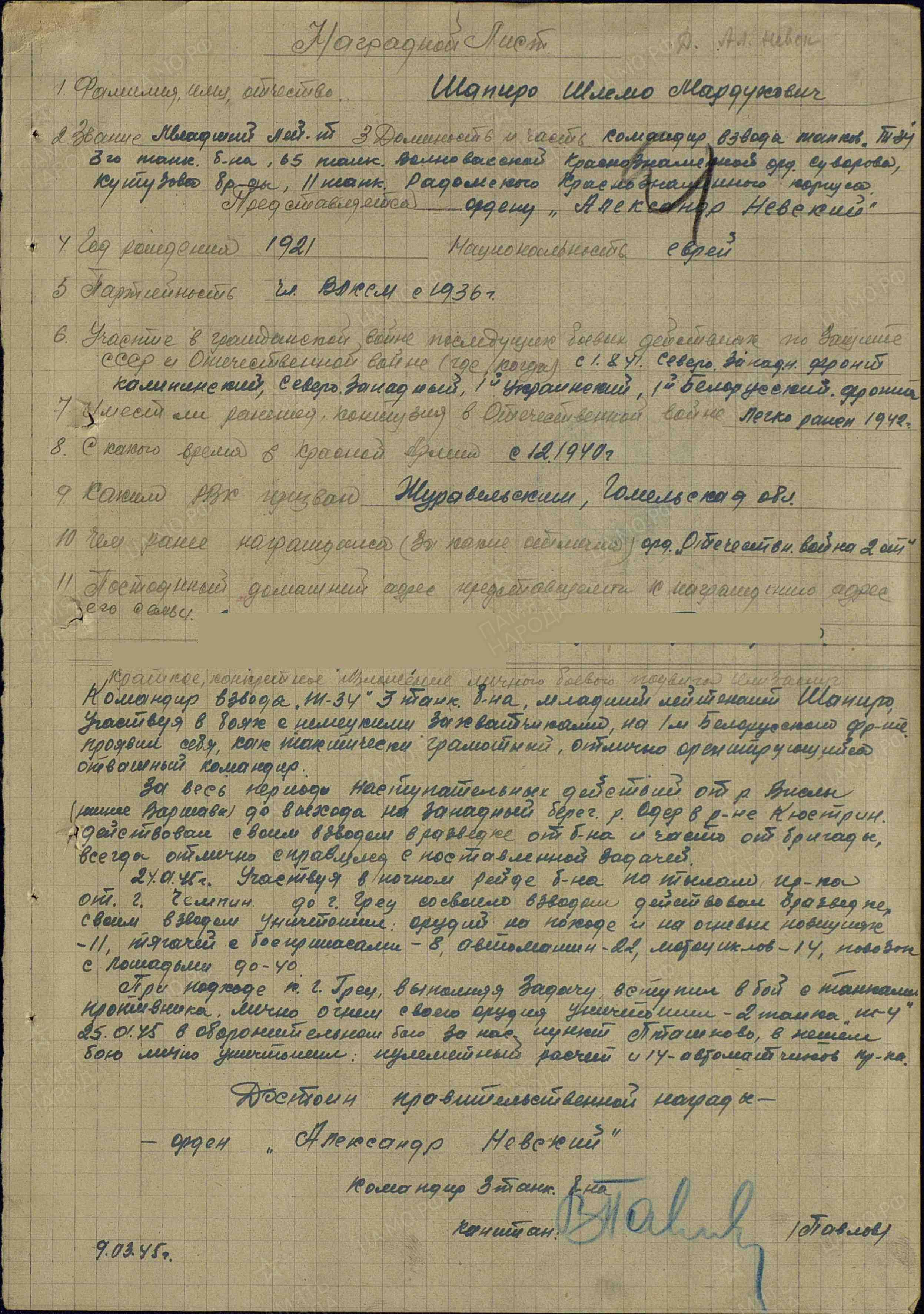 "Командир взвода Т-34, 3 танкового батальона, младший лейтенант ШАПИРО, участвуя в боях с немецкими захватчиками, на 1 Белорусском фронте, проявил себя, как тактический грамотный, отлично ориентирующийся, отважный командир. За весь период наступательных действий, от реки ВИСЛЫ(южнее Варшавы), до выхода на Западный берег реки ОДЕР, в районе КЮСТРИН, действовал, своим взводом, в разведке от батальона и, часто, от бригады, всегда отлично справлялся с поставленной задачей.