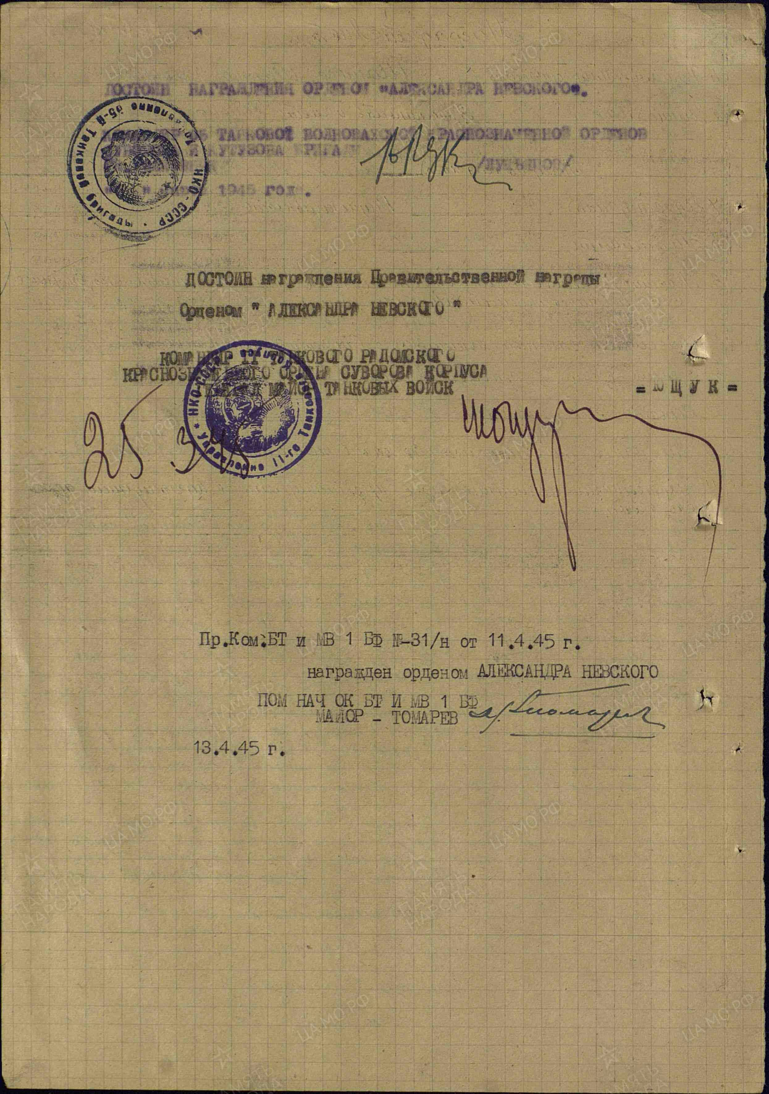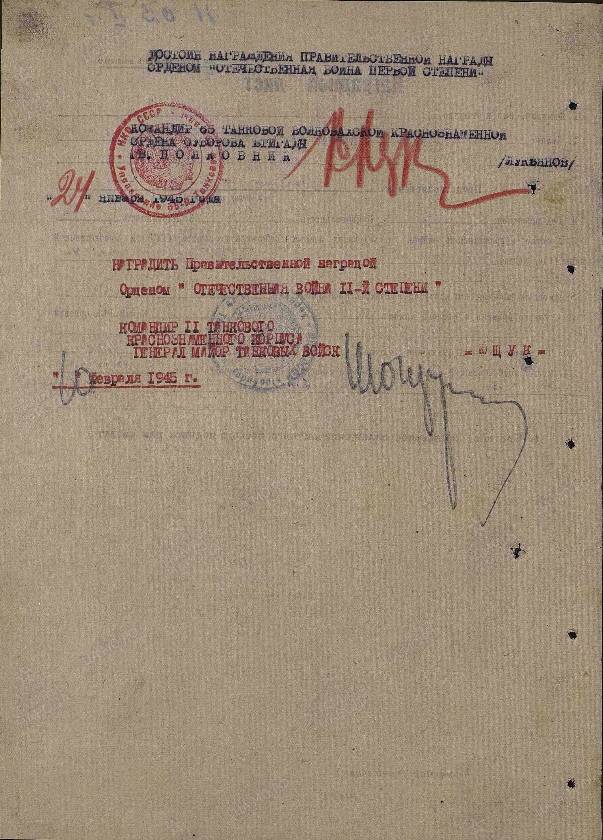 Достоин Правительственной награды ордена "АЛЕКСАНДРА НЕВСКОГО". Командир 3 танкового батальона. Капитан ПАВЛОВ. 9.03.1945 г."; № записи 26724129); 2. Орден "ОТЕЧЕСТВЕННОЙ ВОЙНЫ" 2 СТЕПЕНИ( Из НАГРАДНОГО ЛИСТА на орден "ОТЕЧЕСТВЕННОЙ ВОЙНЫ" 1 СТЕПЕНИ: