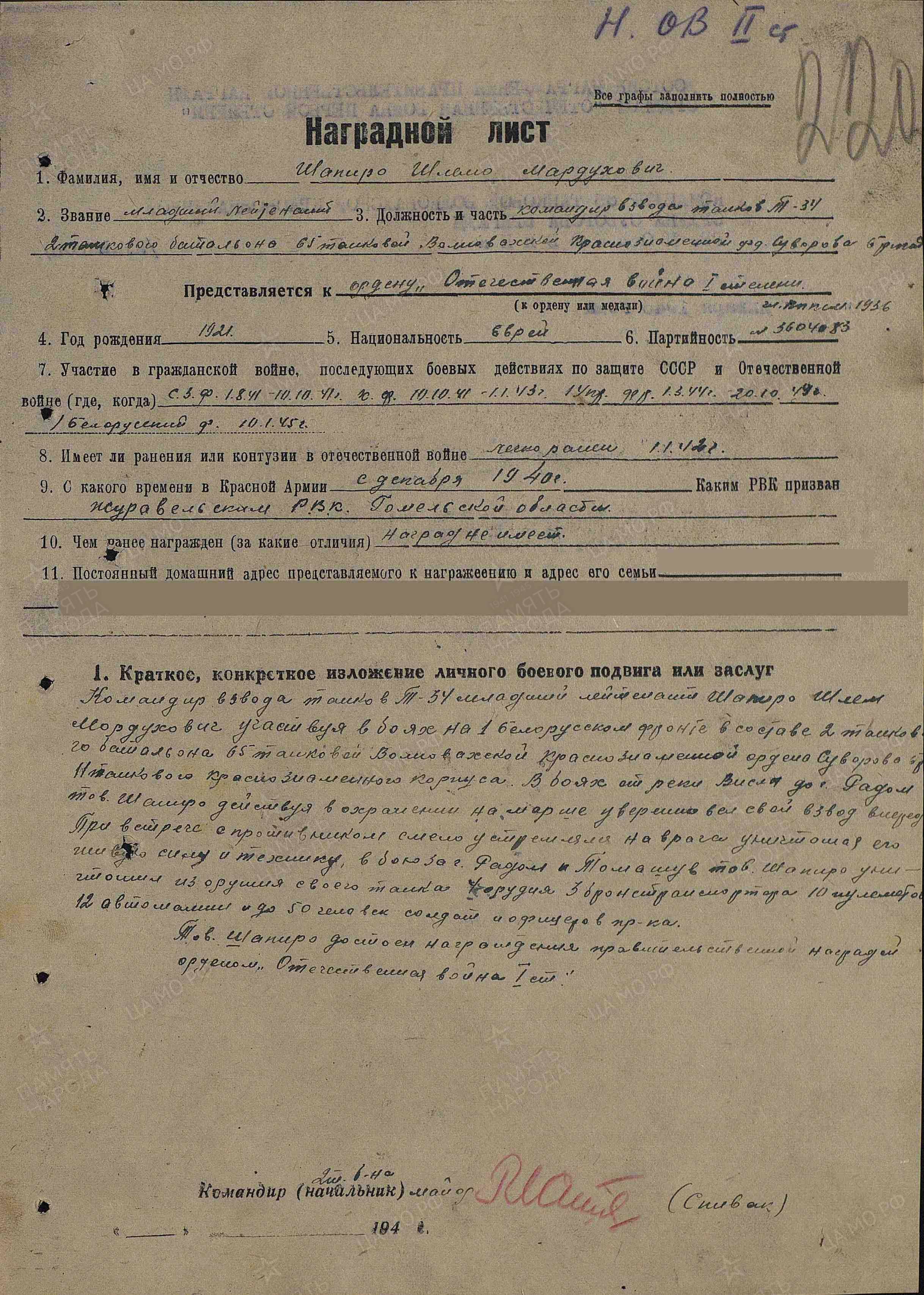 Младший лейтенант ШАПИРО ШЛОМО МОРДУХОВИЧ (прим.: ошибочно: Шлем, Шлемо Мардухович), 1921 года рождения, место рождения - Белорусская ССР, Гомельская область, Журавичский район, еврей. В РККА призван Журавичским РВК, Гомельской области, в декабре1940 года. В Великой Отечественной войне с 1.08.1041 года( на Северо-Западном, Калининском, 1 Украинском , 1 Белорусском фронтах) - Командир взвода танков Т-34 3 танкового батальона 65 танковой Волновахской Краснознамённой орденов Суворова 2 степени и Кутузова 2 степени бригады, 11 танкового Радомского Краснознамённого ордена Суворова корпуса, 8 гвардейской Армии, 1 Белорусского фронта. Ранения: 1. Лёгкое(1942 г.). Боевые награды: 1. Орден "АЛЕКСАНДРА НЕВСКОГО"(Из НАГРАДНОГО ЛИСТА: