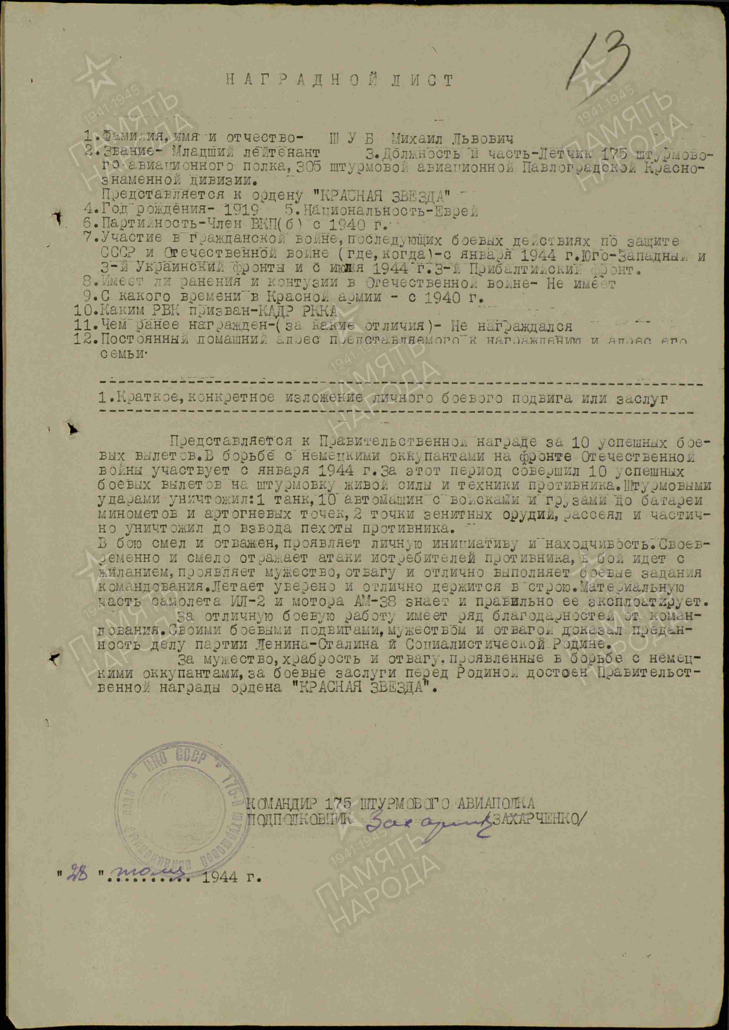 ЛИЧНАЯ СТРАНИЦА на мл. лейтенанта Шуб М.Л. :