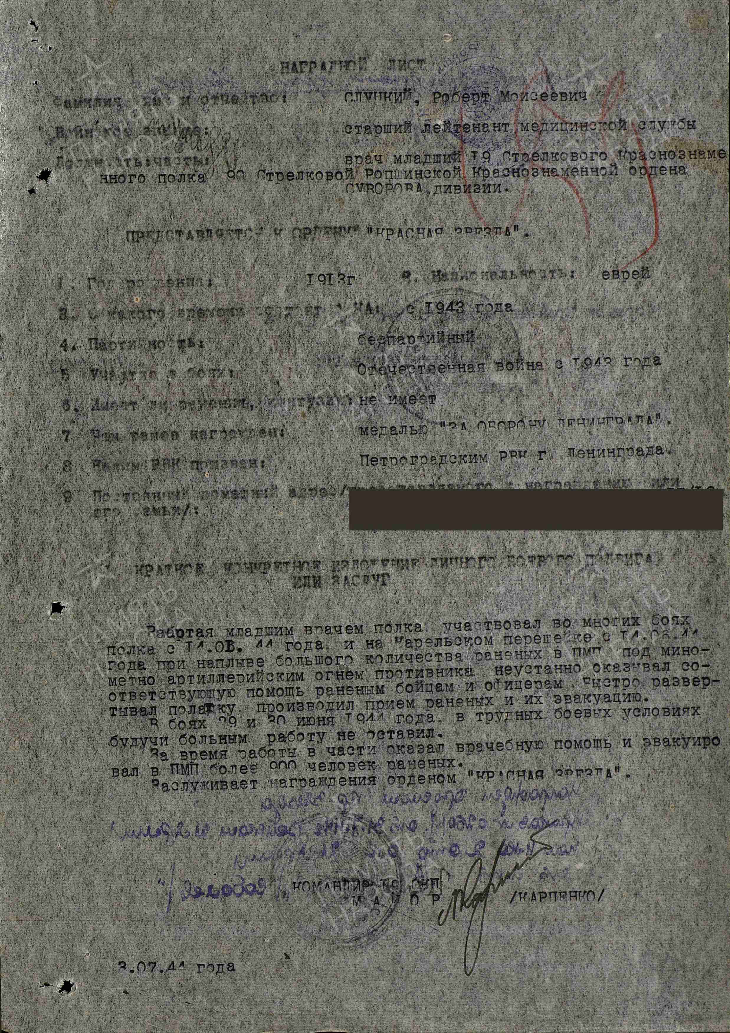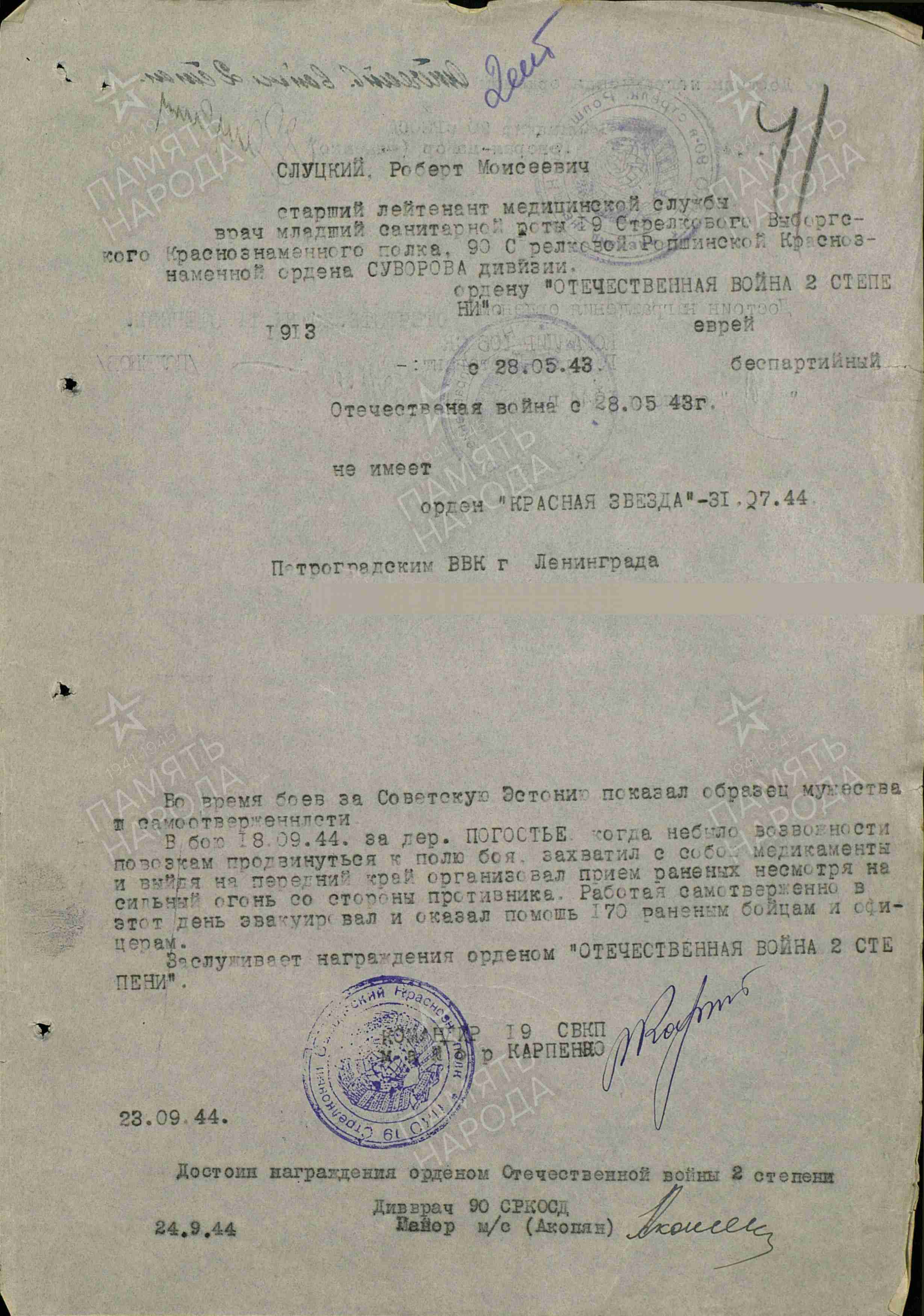 Слуцкий Роберт Моисеевич, 1913 года рождения, место рождения: г. Золотоноша, Полтавская обл., Украинская ССР, еврей. На фронте с 1943 года, работая младшим врачом санитарной роты 19 стрелкового Выборгского Краснознаменного полка участвовал во многих боях полка, в том числе на Карельском перешейке где под минометно-артилерийским огнем противника при наплыве большого количества раненых на полковой медицинский пункт оказывал соответствующую помощь раненым бойцам и офицерам, даже будучи больным. За время работы в части оказал помощь и эвакуировал в полковой медицинский пункт более 900 человек, за что приказом войскам 21 армии от 31.07.1944