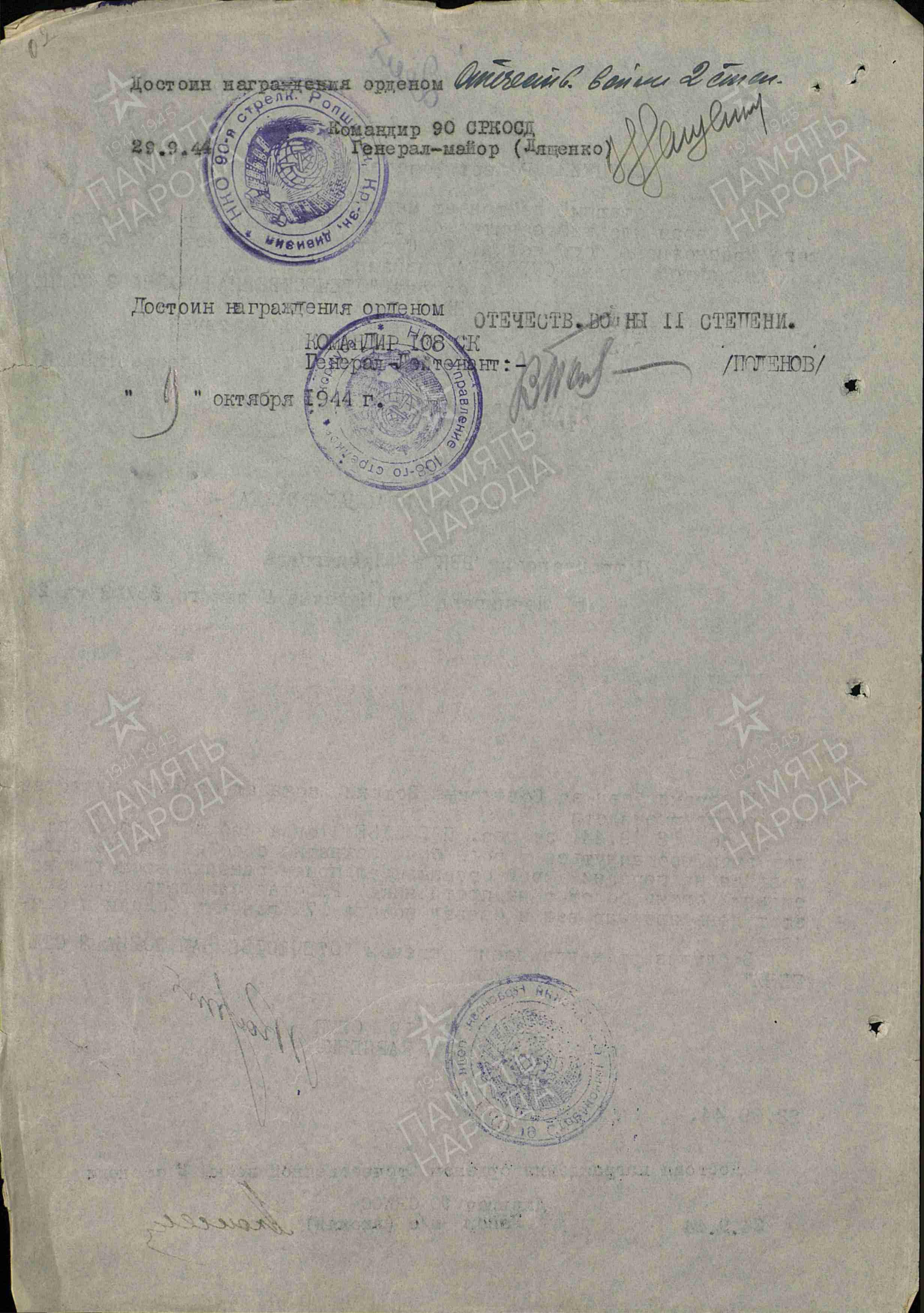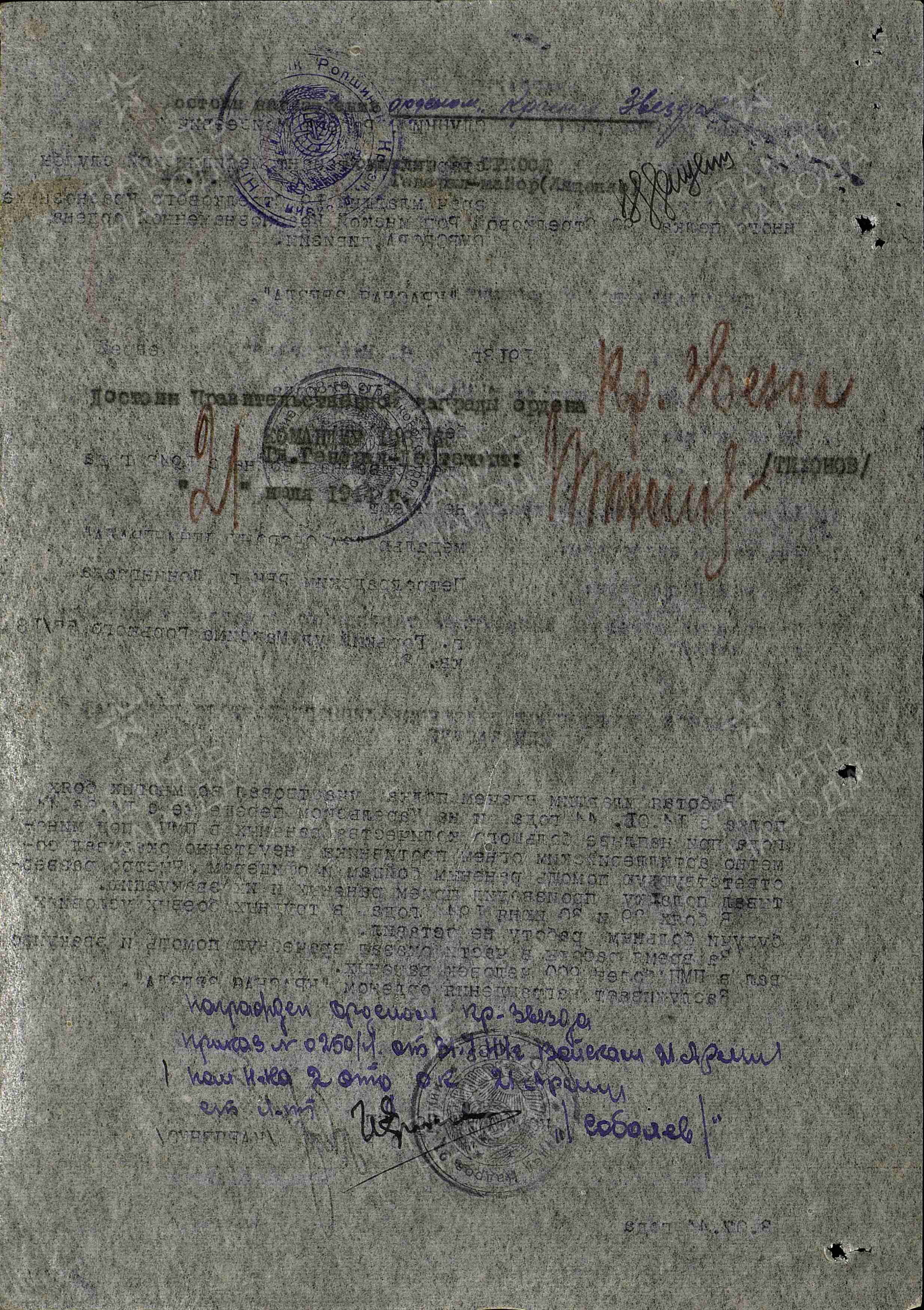№ 250/н был награжден орденом Красной Звезды ( июнь 1944 года).