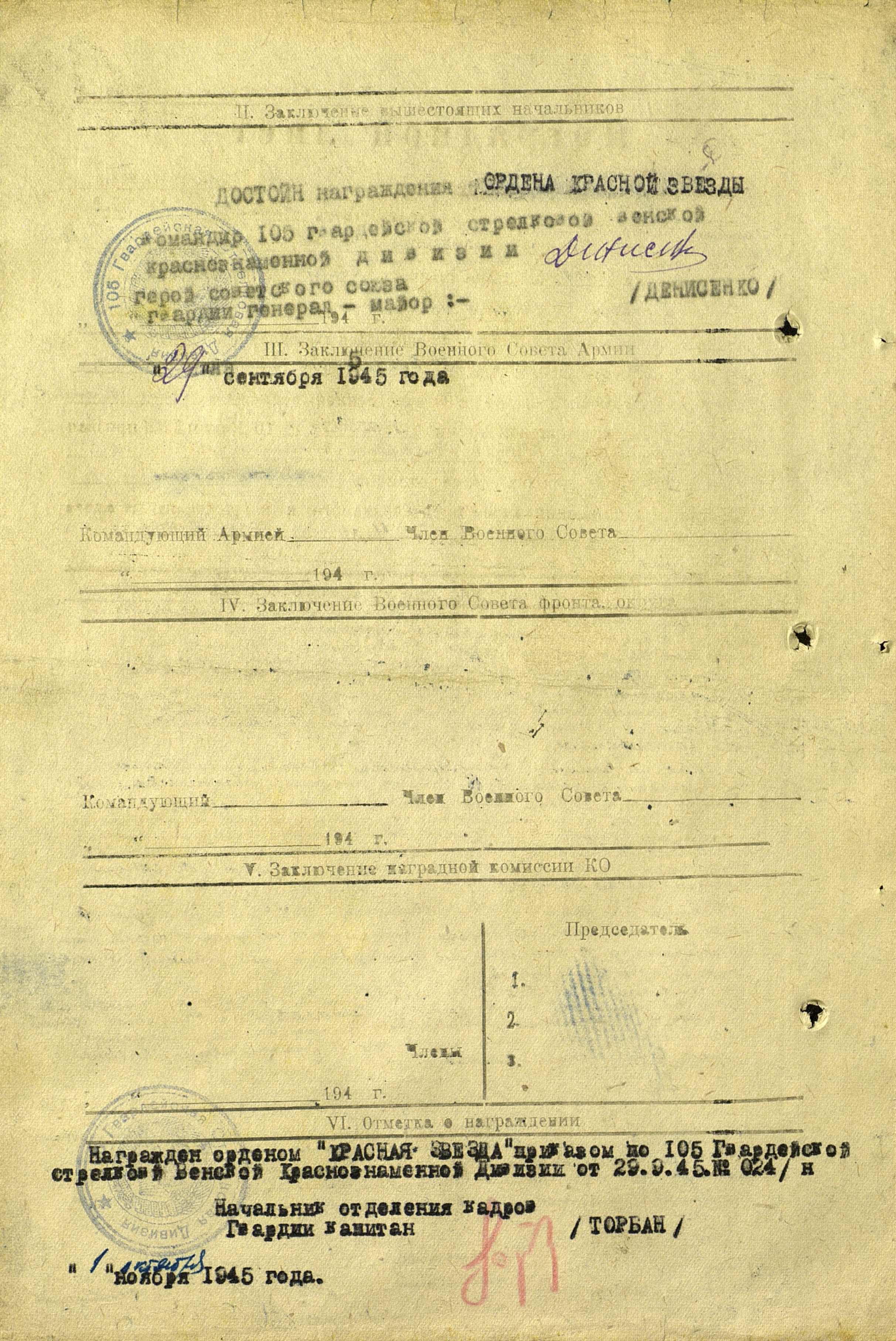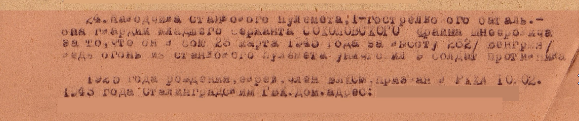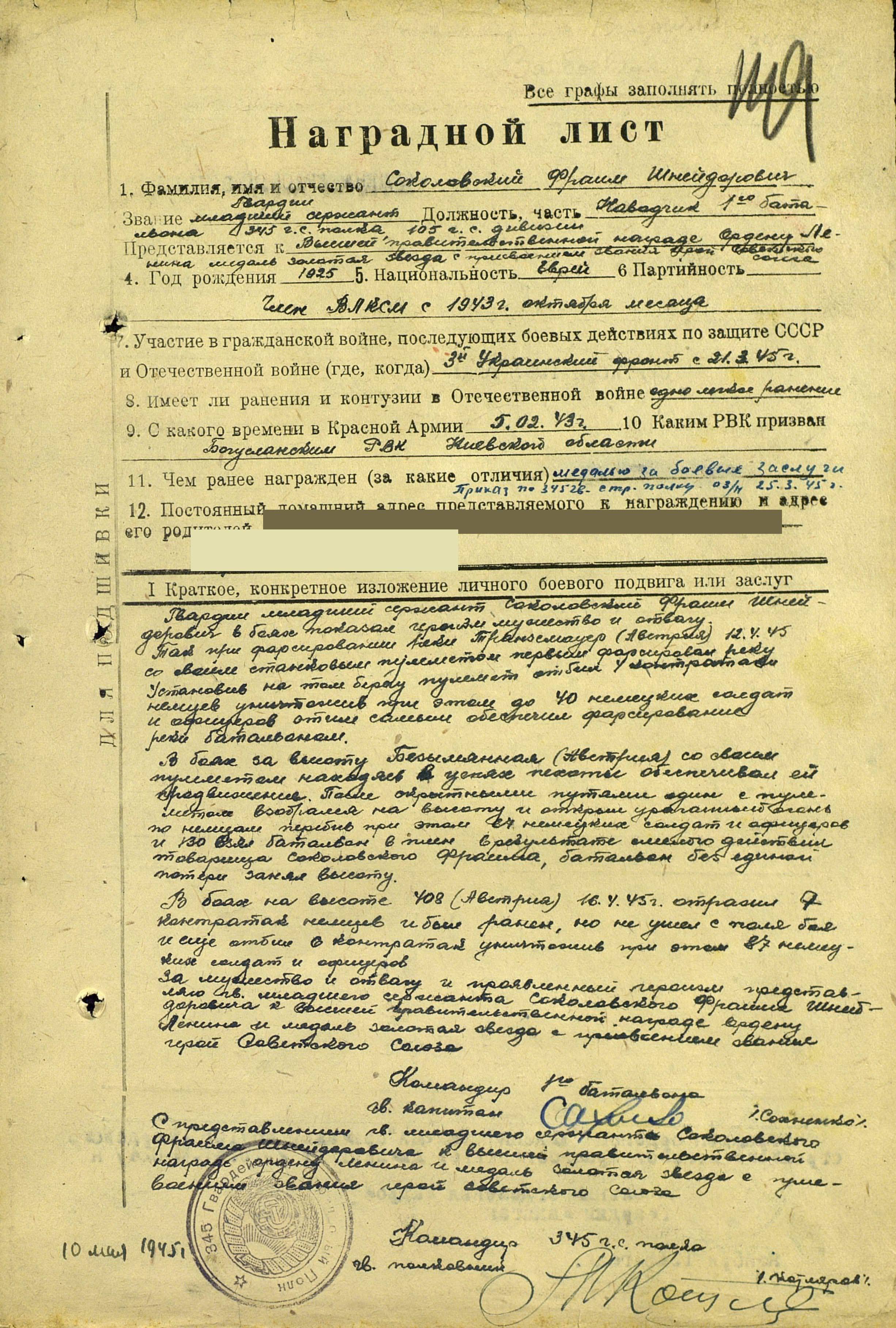 За мужество и отвагу и проявленный героизм представляю гв. младшего сержанта Соколовского Фраима Шнейдеровича к высшей правительственной награде ордену Ленина и медаль золотая звезда с присвоением звания Герой Советского Союза.