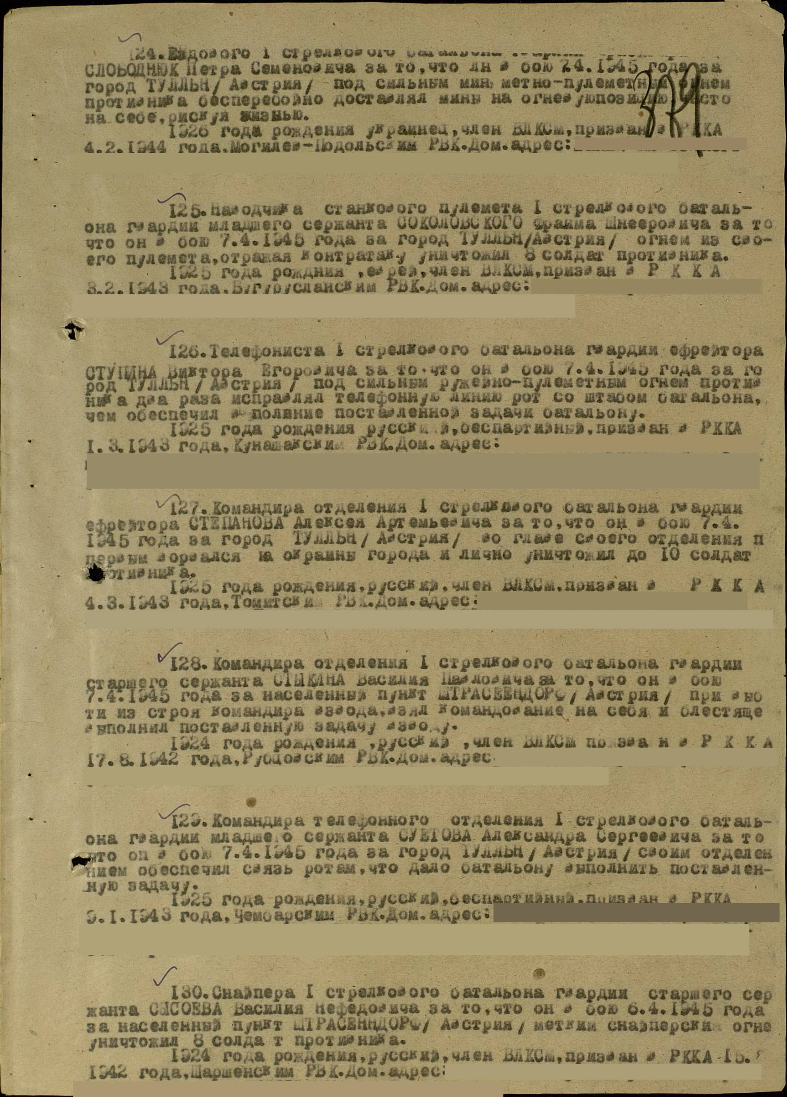 Так при форсировании реки Траносмауер (Австрия) 12.04.1945 со своим станковым пулеметом первым форсировал реку.