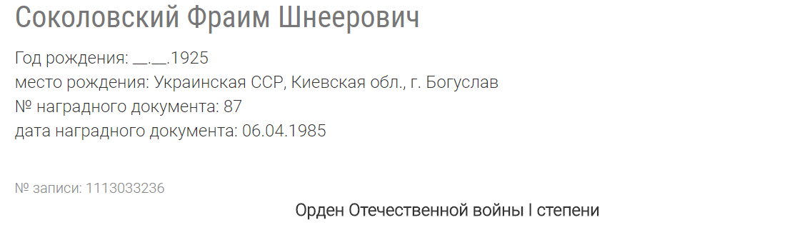 Гвардии младший сержант Соколовский Фраим Шнейдерович в боях показал героизм, мужество и отвагу.
