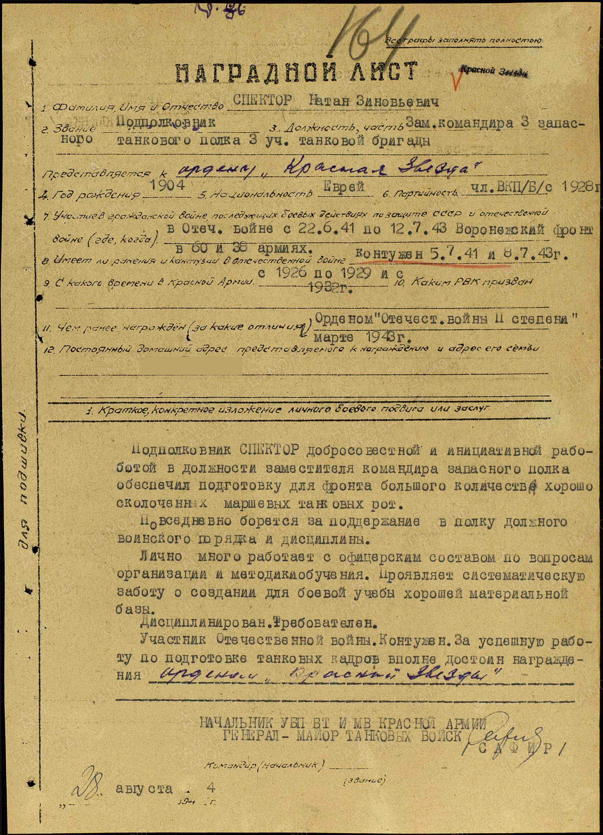 Подполковник СПЕКТОР НАТАН ЗИНОВЬЕВИЧ, 25.10.1904 года рождения, место рождения - Российская Империя, Киевская губерния, Звенигородский уезд, Лысянская волость, местечко Семёновка (по административному делению СССР: Украинская ССР, Киевская область, Лысянский район, село Семёновка), еврей. В РККА призван Звенигородским РВК, Звенигородского района, Киевской области, 09.1926 года. В Великой Отечественной войне с 22.06.1941 года (на Западном, Воронежском, 1 Белорусском фронтах) в должности: Заместителя по политической части командира 180 танковой бригады, 60 армии, Воронежского фронта. Ранения: 1. Контузия (5.07.1941 года); 2. Контузия (8.07.1943 года). Боевые награды: 1. Ордена: "ЛЕНИНА" (1954), "КРАСНОГО ЗНАМЕНИ" (1950), "ОТЕЧЕСТВЕННОЙ ВОЙНЫ" 1 (1985) и 2 (1943) СТЕПЕНЕЙ, "КРАСНОЙ ЗВЕЗДЫ" (2: 1944, 1945); 2. Медаль "ЗА ПОБЕДУ НАД ГЕРМАНИЕЙ В ВЕЛИКОЙ ОТЕЧЕСТВЕННОЙ ВОЙНЕ 1941 - 1945 ГГ." с ЭЛЕКТРОННЫЙ ДОКУМЕНТОВ «ПОДВИГ НАРОДА В ВЕЛИКОЙ ОТЕЧЕСТВЕННОЙ 1941-1945 ГГ.» http://podvignaroda.ru/?#tab=navHome. Вернулся с Великой Отечественной войны. Продолжил службу в ВС СССР. Уволен, в отставку, 12.06.1954 года. Дальнейшая судьба: неизвестна. Вечная Слава и Память!