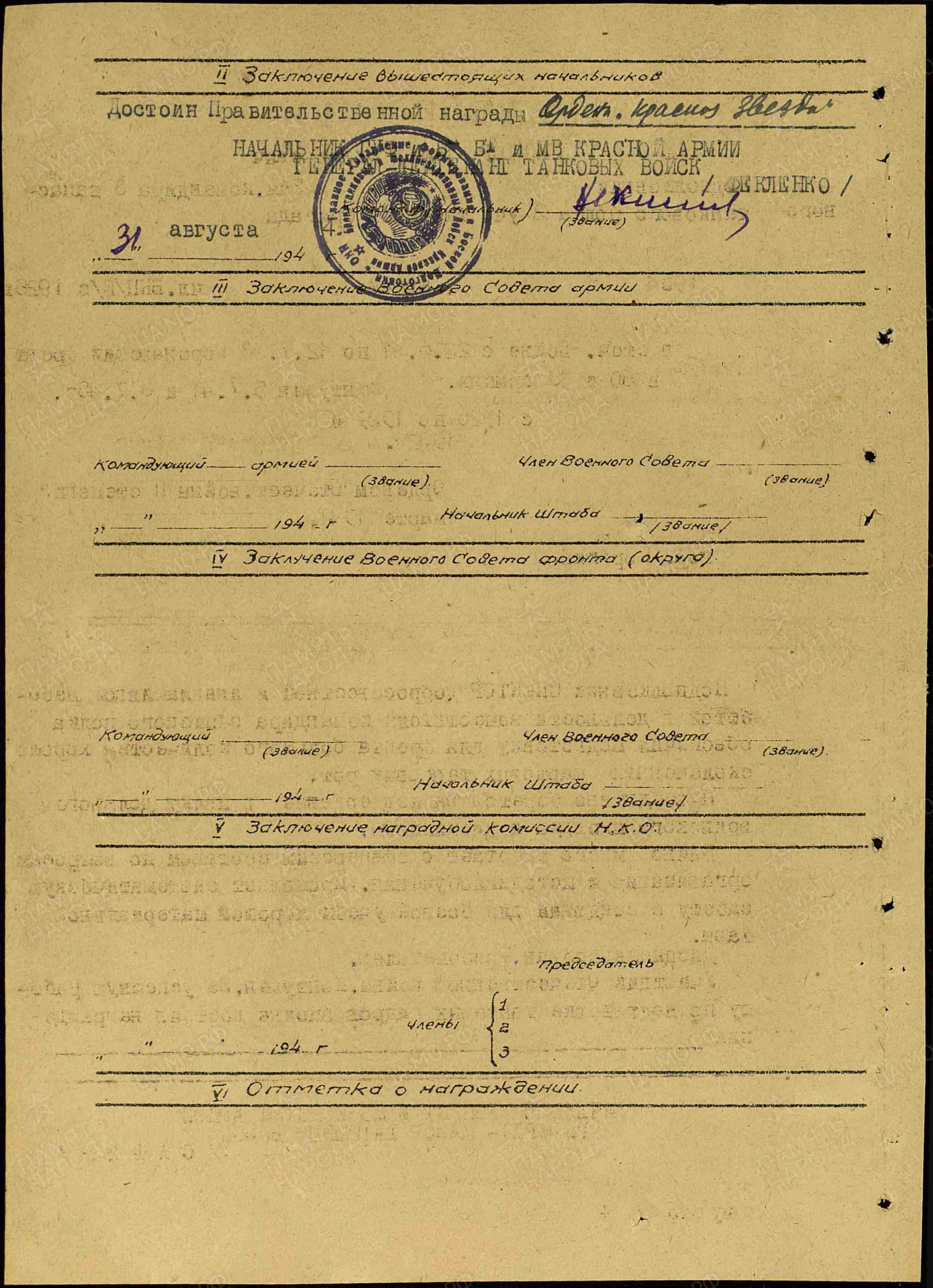 Заместитель по политической части командира 180 танковой бригады, 60 армии, Воронежского фронта. (07.1942 - 22.01.1944).