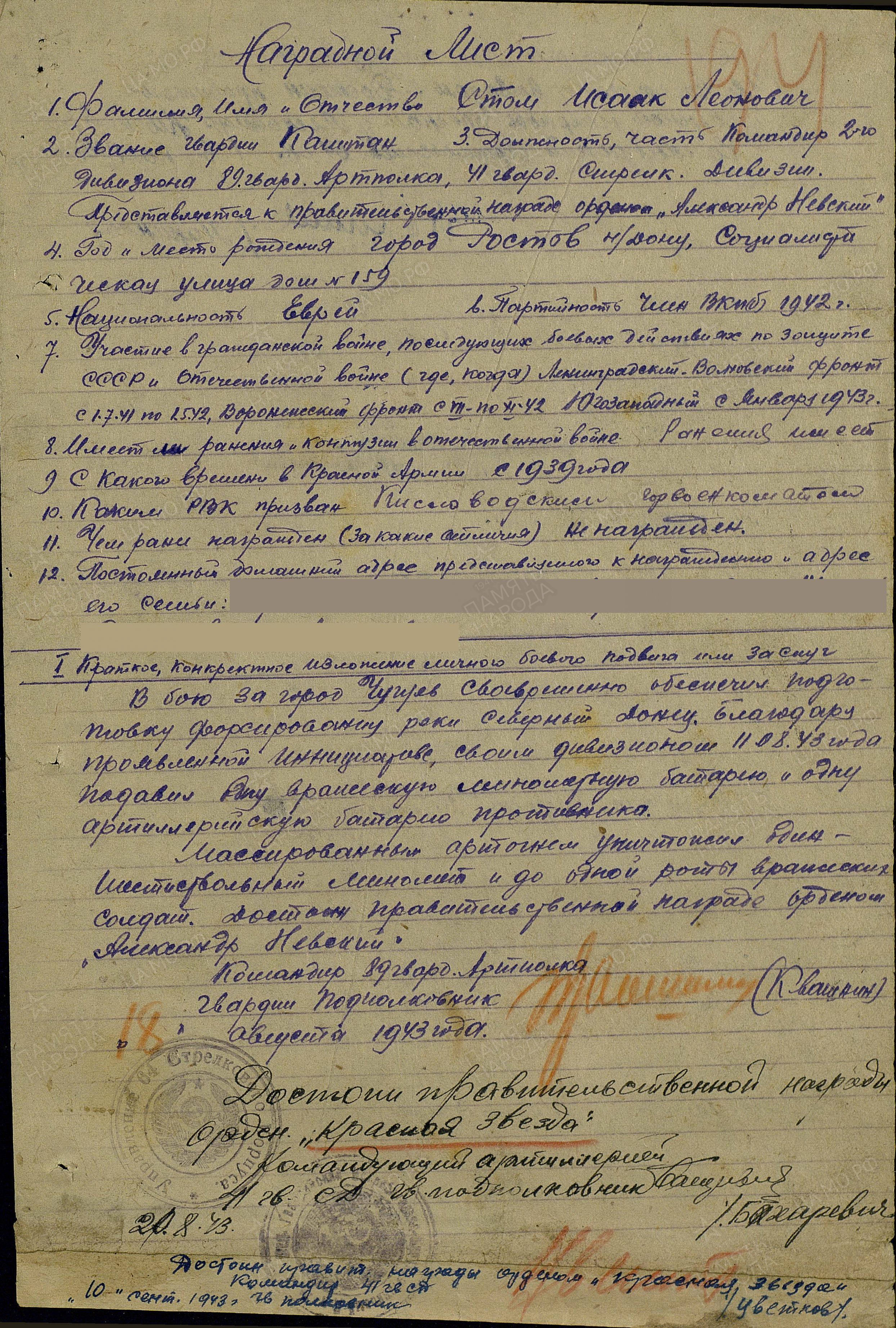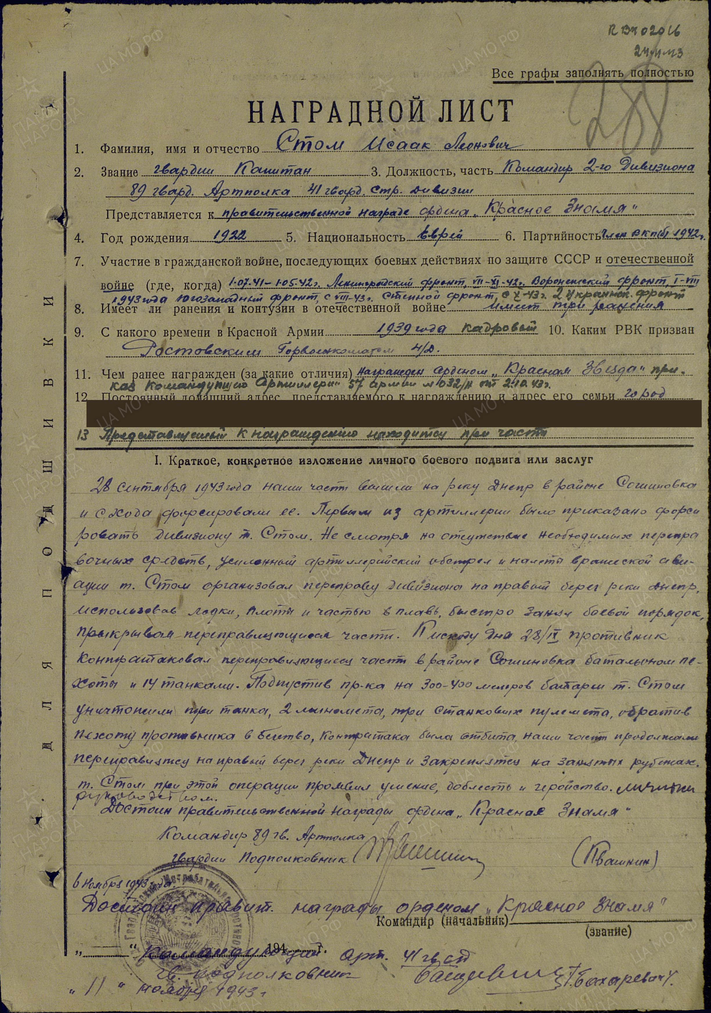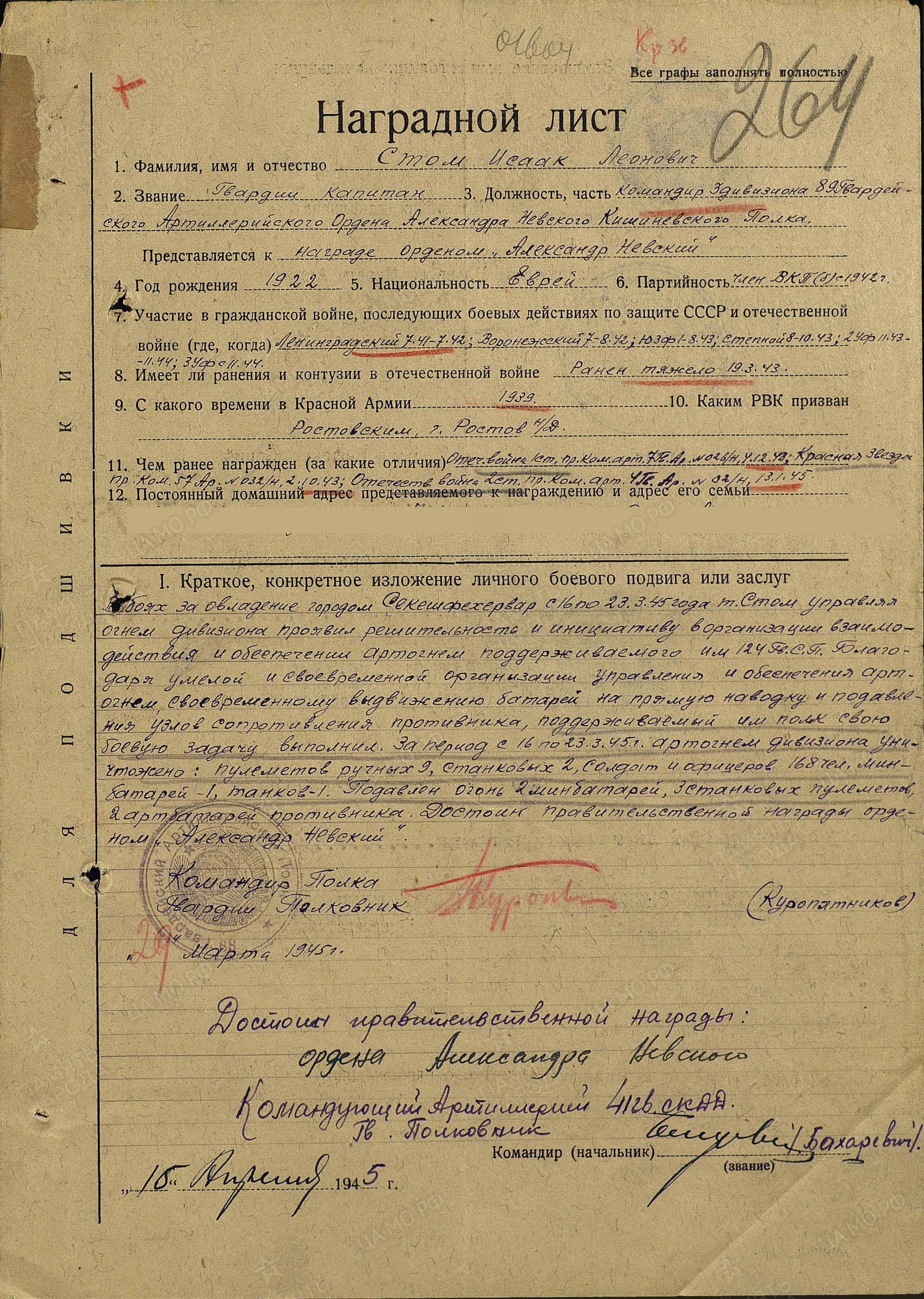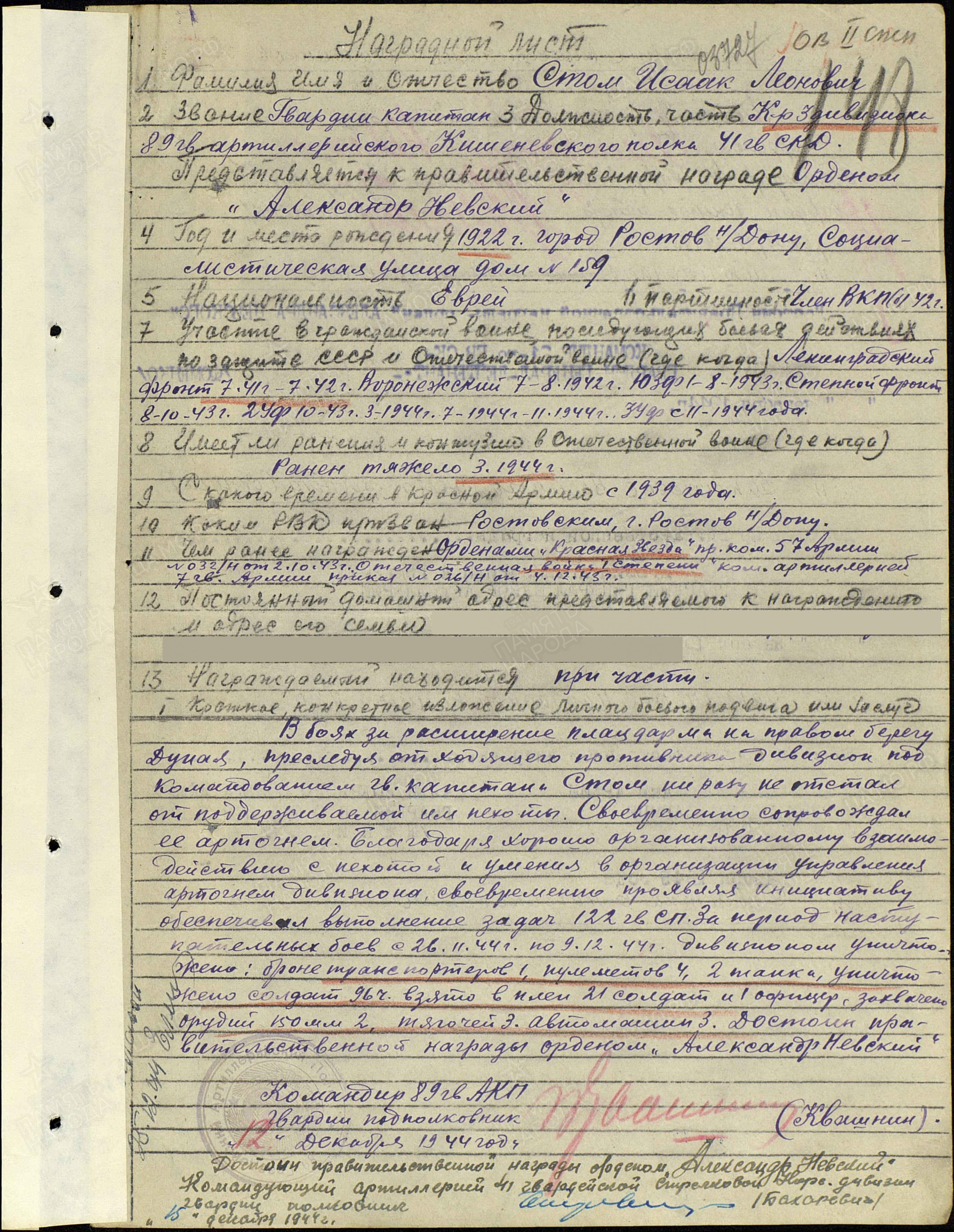 Из наградного листа на гвардии капитана Стома Исаака Леоновича: