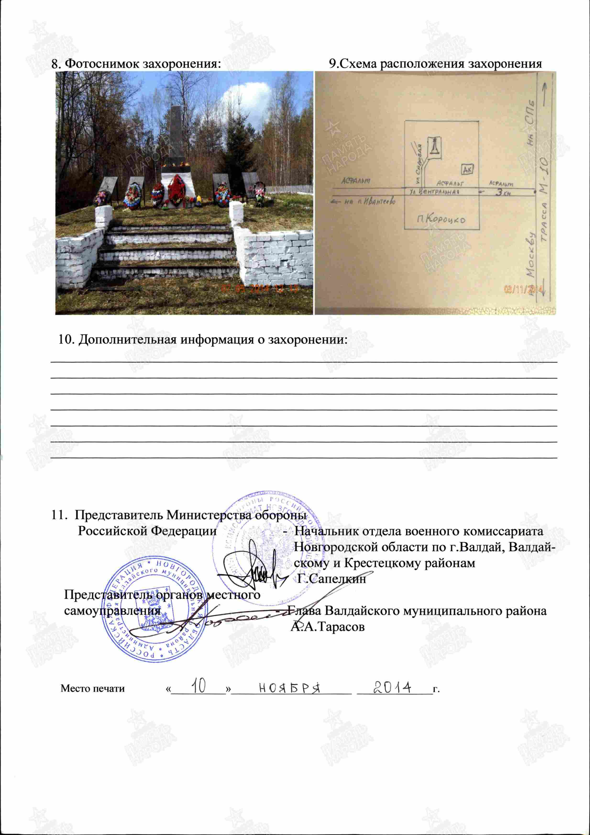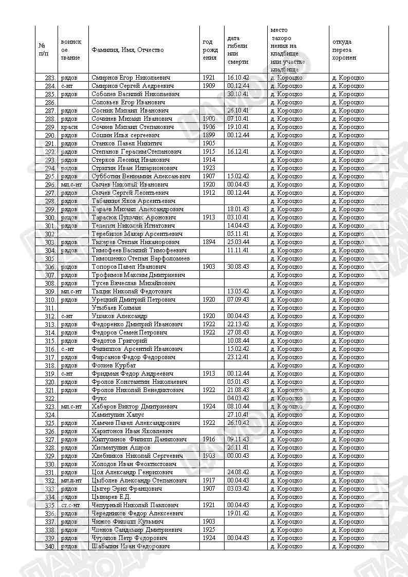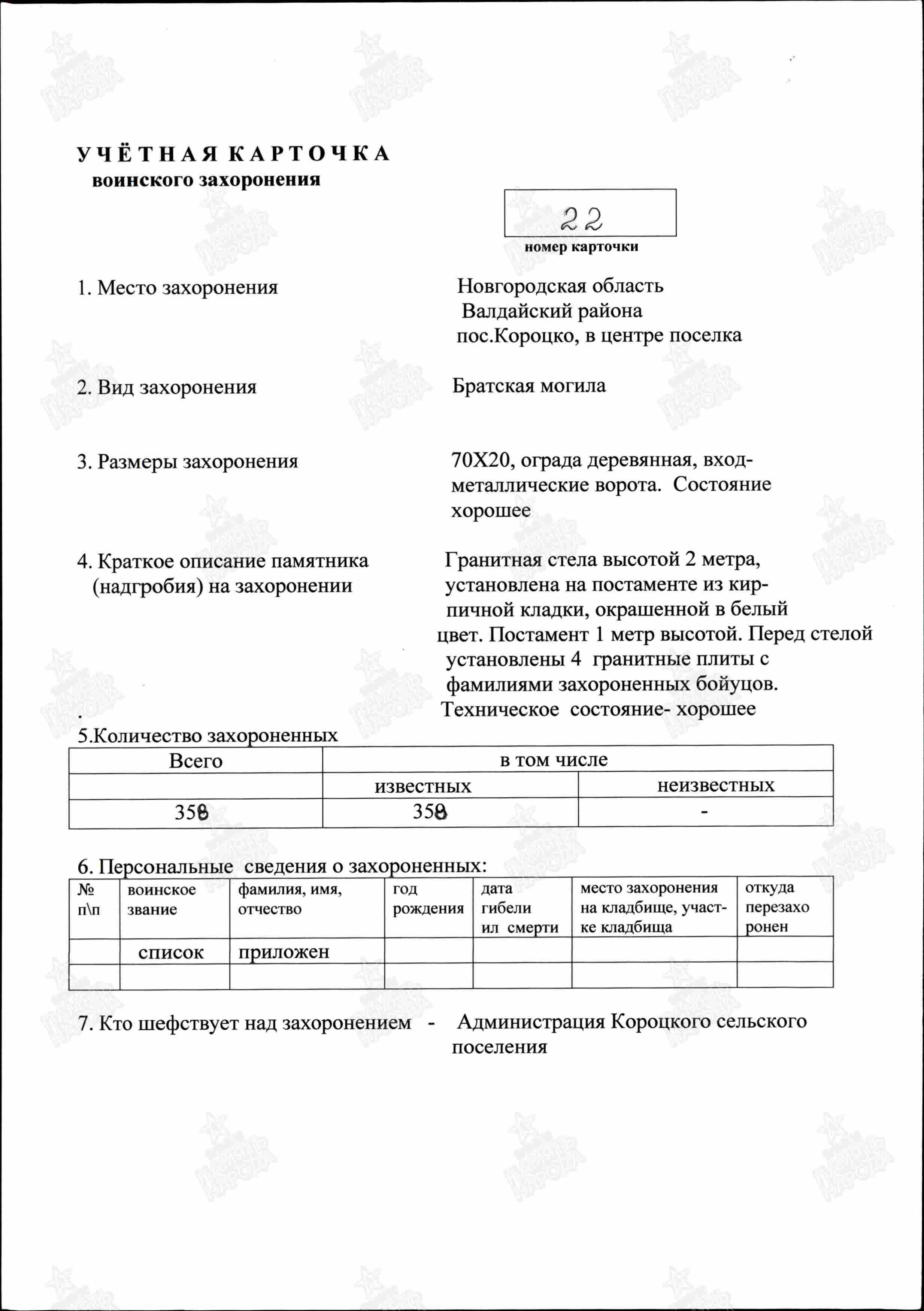 4. Захоронение: РОССИЯ, Новгородская область, Валдайский муниципальный район, Короцкое сельское поселение, посёлок Короцко (центр), братское воинское захоронение ("КНИГА ПАМЯТИ", Северо - Западный федеральный округ: https://memgid.ru/object/5115 ).