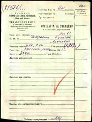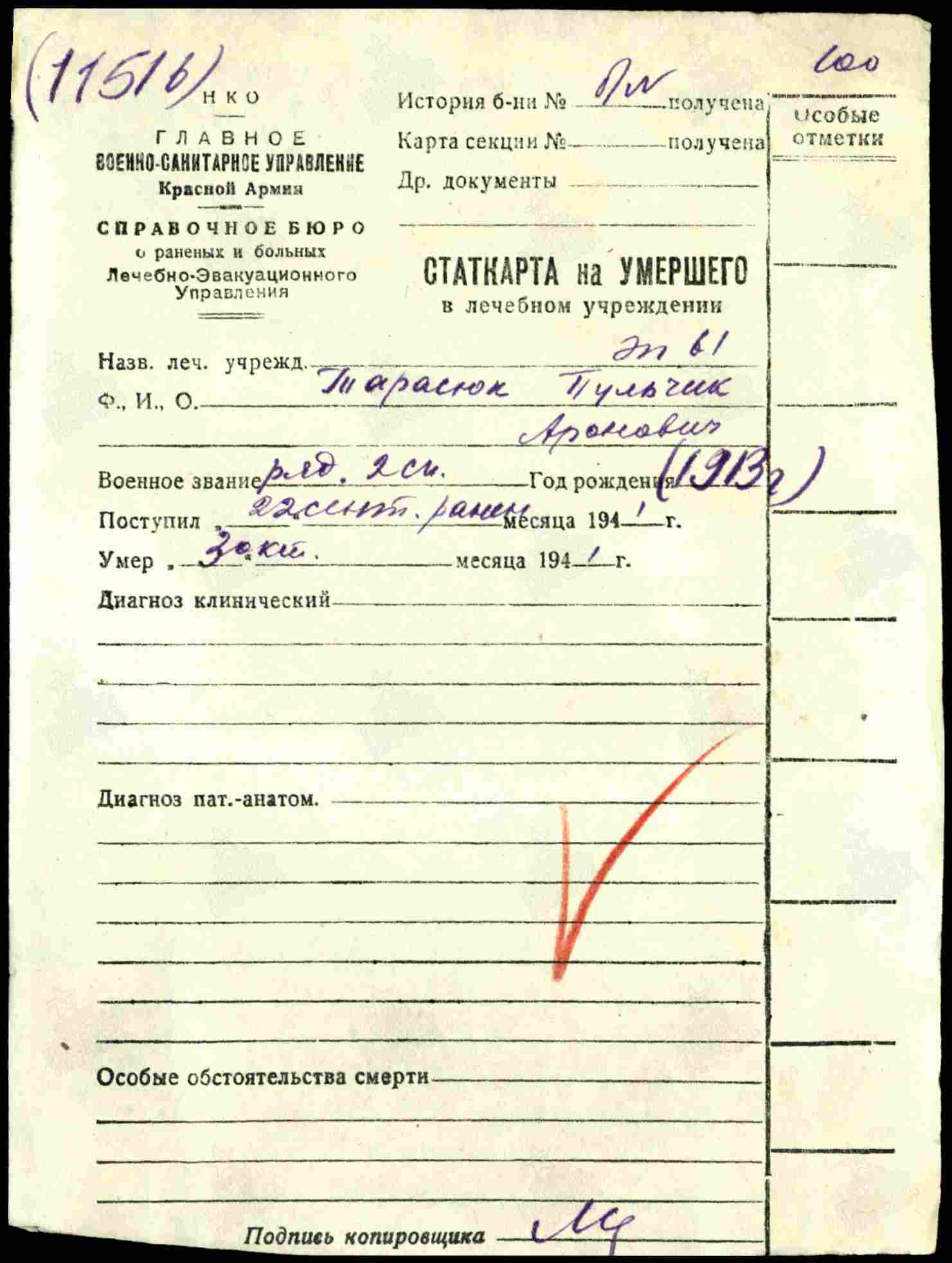 Примечание: Рядовой ТАРАСЮК П. А., 1913 года рождения, место рождения - Российская Империя, Подольская губерния, Ольгопольский уезд, уездный город Ольгополь (по административному делению СССР: Украинская ССР, Винницкая область, Бермотский район, село Ольгополь). В Великой Отечественной войне с 1941 года, в должности стрелка стрелковой роты 2 стрелкового полка, 1 Ленинградской стрелковой дивизии народного ополчения. Тяжело ранен, в бою, и умер от ран 3.10.1941 года. Захоронен: РОССИЯ, Новгородская область, Валдайский муниципальный район, Короцкое сельское поселение, посёлок Короцко (центр), братское воинское захоронение.