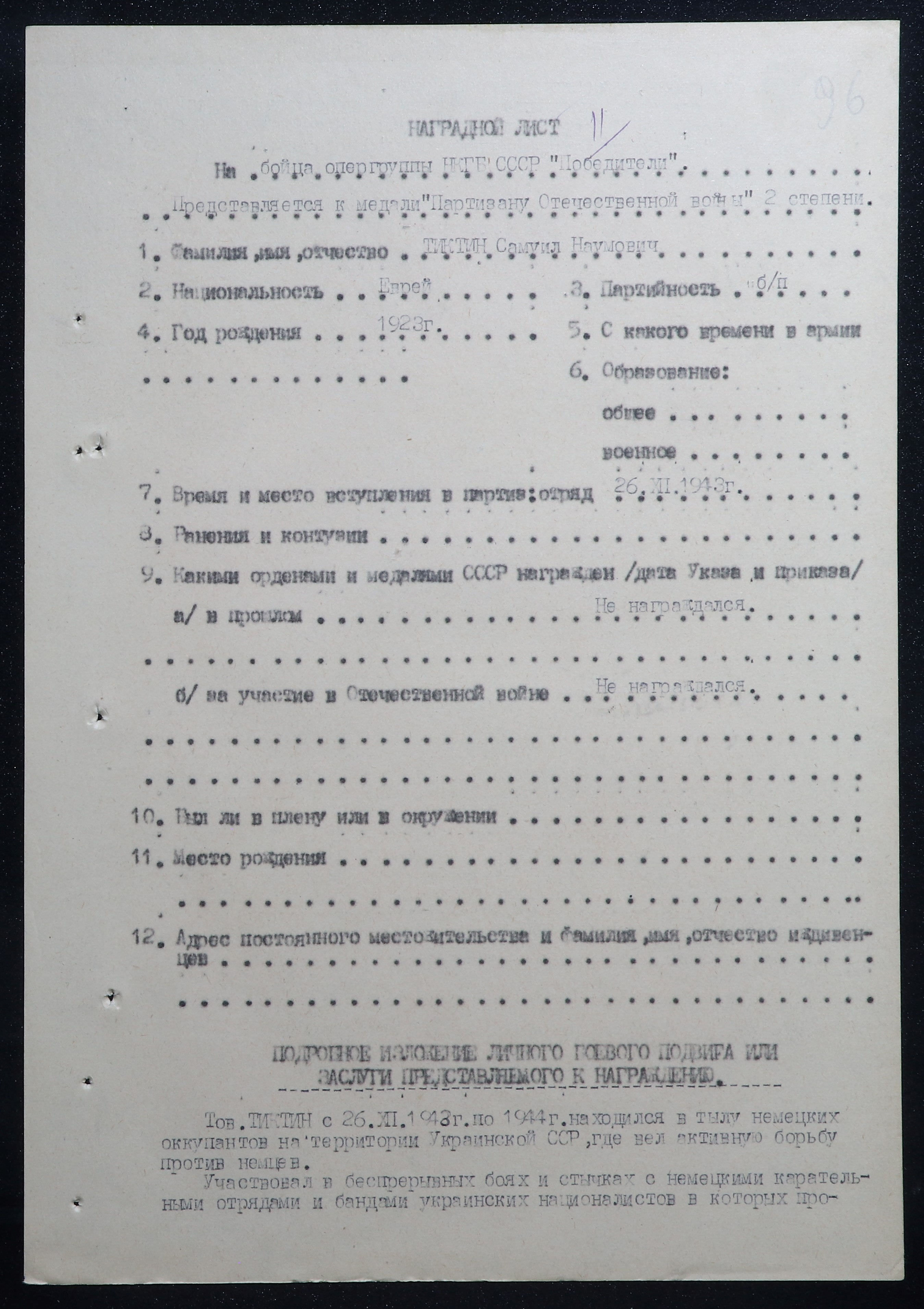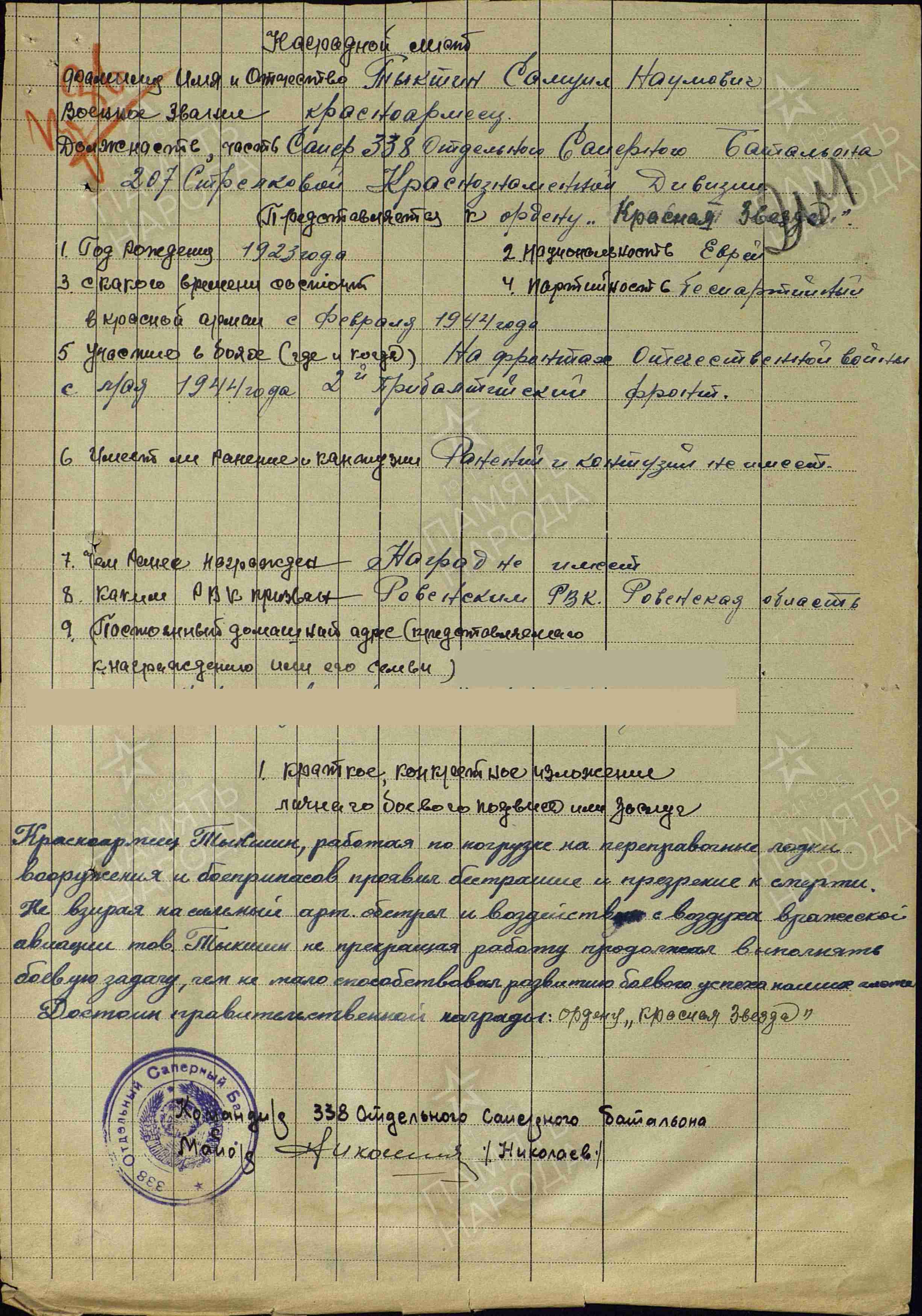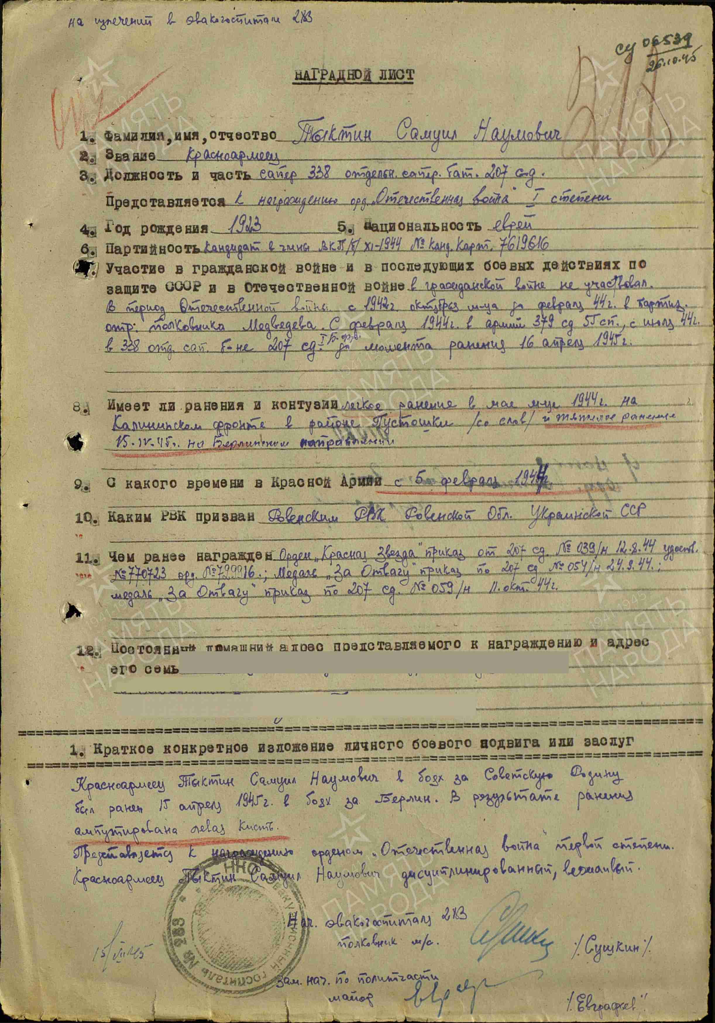 ЛИЧНАЯ СТРАНИЦА  на красноармейца Тыктин С.Н. :